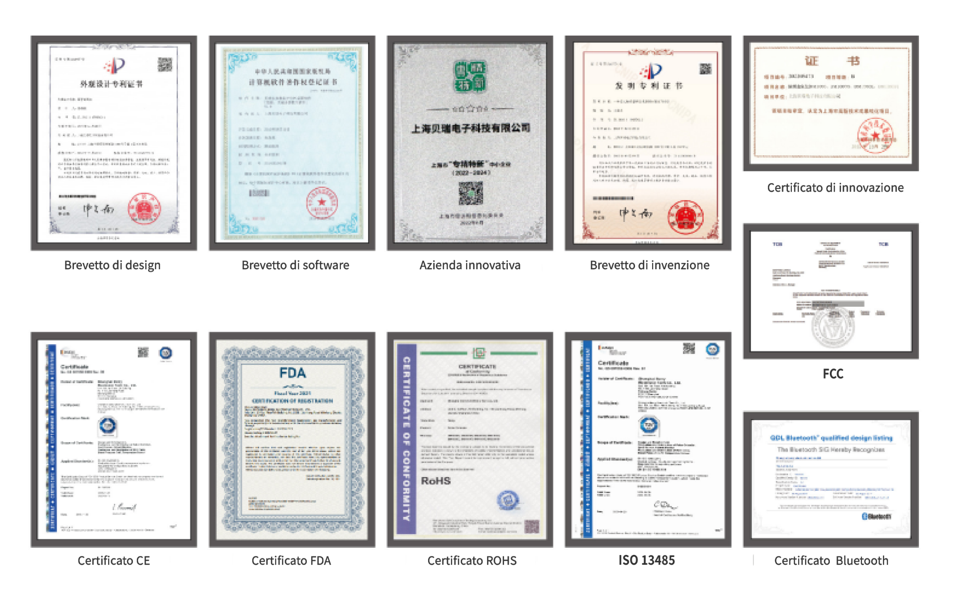 Berry è stata riconosciuta come azienda high-tech nazionale e ha ottenuto lo status di impresa cinese ad alta e nuova tecnologia. Ad oggi, abbiamo accumulato oltre 40 brevetti e più di 30 copyright. Inoltre, Berry ha ottenuto diverse certificazioni, tra cui CE, FDA, ISO13485, ANVISA e INMETRO.